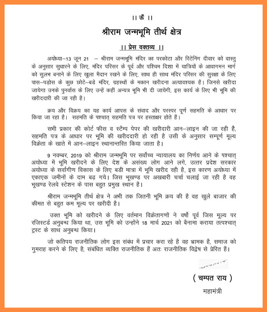ಶ್ರೀರಾಮ ಜನ್ಮಭೂಮಿ ಮಂದಿರದ ಪ್ರದಕ್ಷಿಣಾ ಮಾರ್ಗವನ್ನು ವಾಸ್ತು ಪ್ರಕಾರ ಸರಿಪಡಿಸಲು, ಪರಿಸರದ ಪೂರ್ವ ಹಾಗೂ ಪಶ್ಚಿಮ ದಿಕ್ಕಿನಲ್ಲಿ ಯಾತ್ರಿಗಳ ಓಡಾಟಕ್ಕೆ ಅನುಕೂಲವಾಗುವಂತೆ ಖಾಲಿ ಮೈದಾನ ಕಲ್ಪಿಸಲು ಹಾಗೂ ಮಂದಿರದ ಸುರಕ್ಷತೆಗಾಗಿ ಪರಿಸರದ ಸುತ್ತಮುತ್ತಲಿನ ಮಂದಿರಗಳು ಹಾಗೂ ಮನೆಗಳನ್ನು ಖರೀದಿಸುವುದು ನಮ್ಮ ಅನಿವಾರ್ಯ ಅವಶ್ಯಕತೆಯಾಗಿದೆ. ಈ ರೀತಿ ಖರೀದಿಸಿದ ಮಂದಿರಗಳಿಗೆ ಬೇರೆಡೆ ಸ್ಥಳಾವಕಾಶ ಕಲ್ಪಿಸುವ ಉದ್ದೇಶದಿಂದ ಅಯೋಧ್ಯೆಯಲ್ಲಿ ಭೂಮಿ ಖರೀದಿಸಲಾಗುತ್ತಿದೆ.