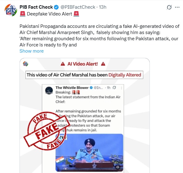ನವದೆಹಲಿ: ಏರ್ ಚೀಫ್ ಮಾರ್ಷಲ್ ಅಮರ್ಪ್ರೀತ್ ಸಿಂಗ್ ಅವರ ನಕಲಿ AI-ರಚಿತ ವೀಡಿಯೊವನ್ನು ಸೃಷ್ಟಿಸುವ ಮೂಲಕ ಪಾಕಿಸ್ಥಾನ ಭಾರತದ ವಿರುದ್ಧ ಮತ್ತೊಂದು ಷಡ್ಯಂತ್ರವನ್ನು ನಡೆಸಿದೆ. ಭಾರತ ಈ ವಿಡಿಯೋವನ್ನು ಸುಳ್ಳೆಂದು ಬಹಿರಂಗಪಡಿಸಿದೆ.