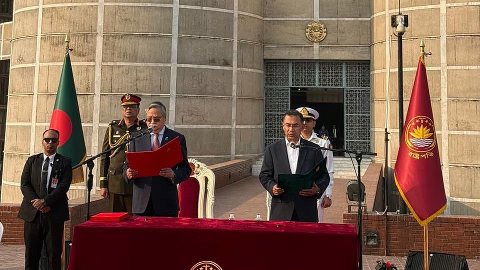 ಢಾಕಾ: ಬಾಂಗ್ಲಾದೇಶ ಬಿಎನ್ಪಿ ಪಕ್ಷದ ಅಧ್ಯಕ್ಷ ತಾರಿಖ್ ರೆಹಮಾನ್ ಮಂಗಳವಾರ ಬಾಂಗ್ಲಾದೇಶದ ಹೊಸ ಪ್ರಧಾನಿಯಾಗಿ ಜತಿಯಾ ಸಂಗ್ಸದ್ ಭಬಾನ್ನ ದಕ್ಷಿಣ ಪ್ಲಾಜಾದಲ್ಲಿ ನಡೆದ ಸಮಾರಂಭದಲ್ಲಿ ಪ್ರಮಾಣ ವಚನ ಸ್ವೀಕರಿಸಿದರು.